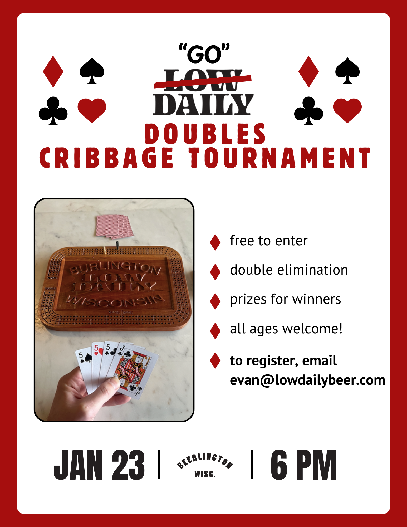 Cribbage Tournament Friday, January 23, 2026 6:00 PM 9:00 PM 18:00 21:00 Low Daily 700 North Pine Street Burlington, WI, 53105 United States (map) Google Calendar ICS spots still available!